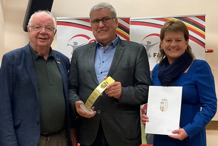 Karin Hörzing, Vizebürgermeisterin von Linz, und ASVÖ Ehrenpräsident Herbert Offenberger bedanken sich in Vertretung von Landesrat Markus Achleitner bei Herrn Hübner für seinen unermüdlichen Einsatz und überreichen das Landessportehrenzeichen in Gold.