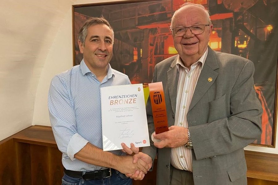 ASVÖ-Ehrenpräsident Herbert Offenberger bedankt sich im Namen des Allgemeinen Sportverbandes Oberösterreich bei Herrn Lehner für seinen unermüdlichen Einsatz und überreicht das Landessportehrenzeichen in Bronze.